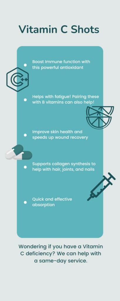 Vitamin C shots will likely always be beneficial; however, there are times where they are particularly beneficial. Some of these times could be during times of increased stress, such as periods of illness or high physical activity. They can also be a great option for individuals with dietary restrictions or absorption issues that may hinder their ability to get an adequate amount of Vitamin C through food alone. For example, the stomach bug, flu, or surgery recovery can impact the nutrients individuals are able to receive.